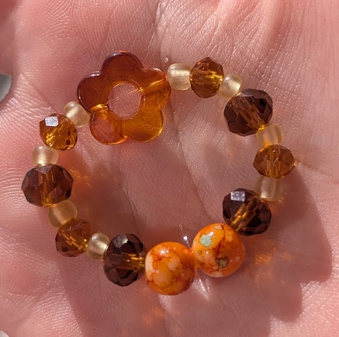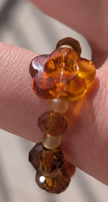 This handcrafted bracelet captures the raw power and beauty of a volcano. It features a stunning mix of rich, fiery amber and deep, smoldering brown beads, reminiscent of molten rock and cooled lava. The design is accented by sparkling faceted beads that glimmer like crystals within the rock, while a translucent flower bead adds a unique, glowing touch. This bracelet is a bold statement piece, perfect for anyone who wants to add a powerful and natural element to their style.