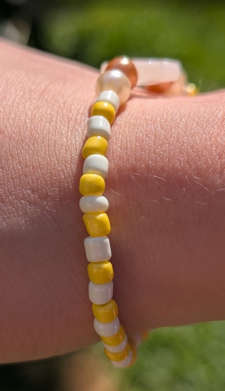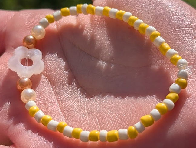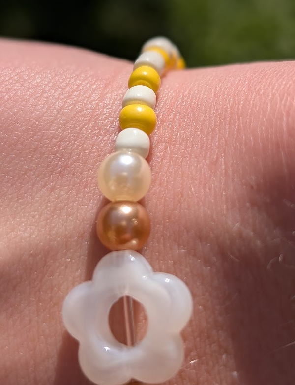This charming, handcrafted bracelet brings a touch of sunshine to any look. It features a cheerful mix of golden yellow and creamy white beads, reminiscent of a sunflower’s petals and center. A stunning, translucent flower bead takes center stage, while elegant, pearlescent accents add a beautiful shimmer. This piece is perfect for adding a pop of color to your day and makes a wonderful accessory for any season.
